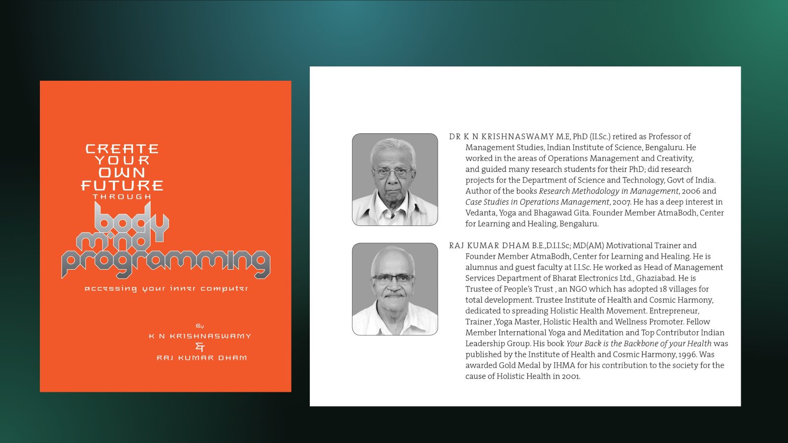 " Create Your Own Future Through Body Mind Programming is a though-provoking book that empowers every individual to realize their inner potential for success. People often look to other places for answers unaware that the solution is within. BMP based Heart-Mind Yoga sessions helped the patients and their caregivers of Integrative Oncology Department in moving from fear to hope and improving their quality of life."